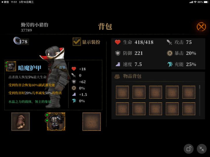思路:怪多,人物变大,意味着我们是活动靶,那就让他们打,我们靠副武器输出,为了预防罚站暴毙,考虑几率减伤,或者加防御增加容错率。基本上只要不作死,血都是基本上满的。如果对自己操作有信心可以放弃防御,带地图速刷,或者带吸血牙增加生存率。