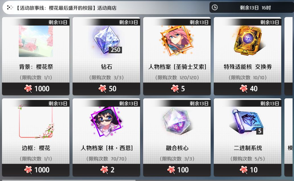 活动限定商店同步开启,老板可通过挑战剧情关卡获得限定道具【樱花味糖果】,使用道具在商店内兑换到包括“背景:樱花祭”、“边框:樱花”、“融合核心”、“二进制系统”、“高级装备材料”等道具。