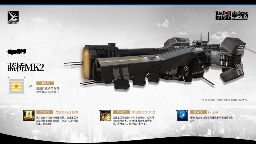 管理局将在本周开放新的战争科技情报,新的SSR强袭舰船“蓝桥MK2”将于周四更新维护后开放建造。老板在通关剧情第4章关卡4-4后,可至公司内机库使用高弹性装甲、特殊舰船设计图纸、舰船高级材料以及金币打造。SSR强袭舰船“蓝桥MK2”的主动技能可为选定区域增加技能充能速度、恢复体力的增益效果。
