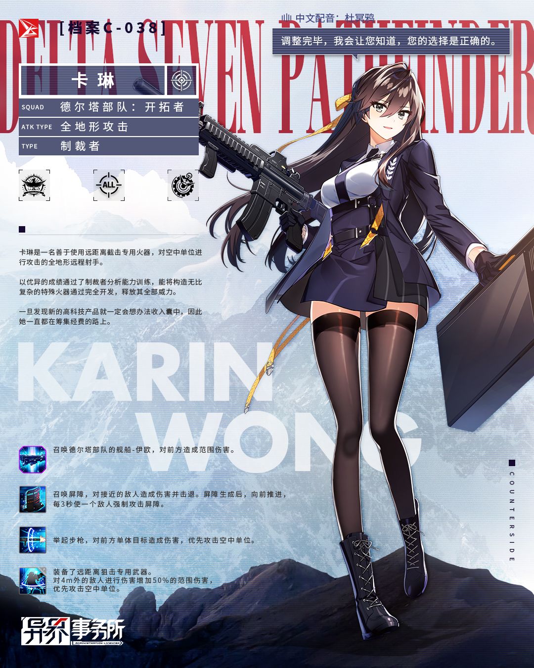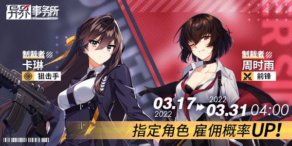 SSR制裁者周时雨、卡琳将于本周更新维护后开启各自的雇佣概率UP卡池,周时雨能够提升自身的闪避能力并对敌人施以反击,卡琳是可对空中单位进行攻击的全地形远程射手,老板可根据公司战备情况前往雇佣。