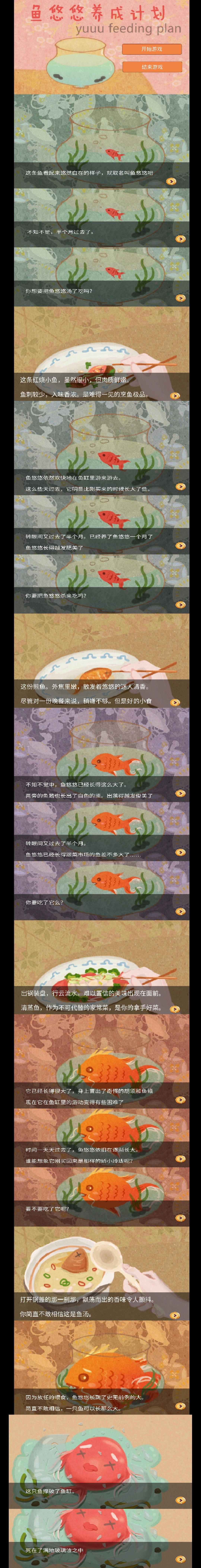 。如果想玩到全部剧情,可以每一次都选吃了它,再反悔继续养大。选项的话可以每次点点新出的选项,其余全选“说话”,因为选项本身不会对游戏产生影响,反而“说话”里面的话很有意思,感觉开发者也是个很有趣的人,才能想出这么多奇奇怪怪不重复的话(每次说的第一句话都是问鱼悠悠好不好)。最后的结局就是鱼总有一死,所以大家觉得致郁了吧