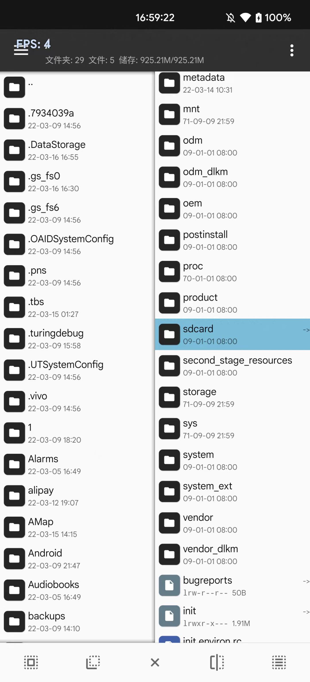 那么打开我们的管理器后会发现他有左右两个栏 其中左侧是我们常用的文件路径 右侧需要手动找到sdcard文件夹点进去 点进去之后和左侧的文件是一样的