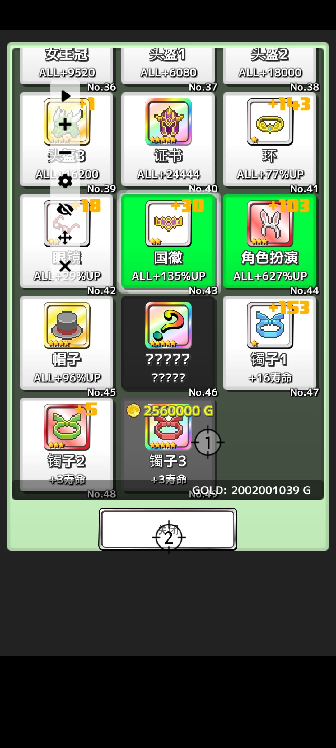 但是经过仔细考虑,5000w级无尽一个怪250万的金币,游戏金币在大后期是线性增加的,后边很容易形成打怪10分钟抽奖2小时的情况,于是我们完全可以推一个小时无尽,然后挂机一晚上用连点器抽奖,这样就能节约很多时间叠饰品倍率。于是用一天时间做最终装备的铺垫应该是不错的选择。
