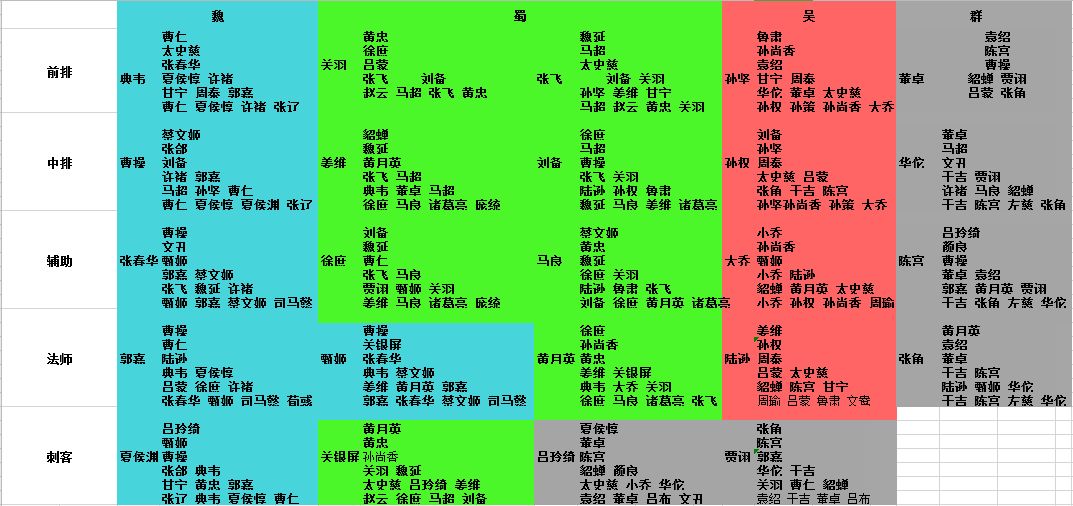 经过内测的测试,本人玩了两个角色,运气都不错一个群雄,一个吴国。其他的国家也抽到不少,于是在下面总结了一个阵容给大家。