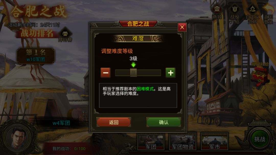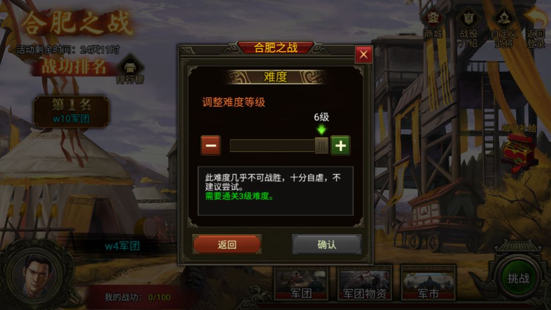 合肥之战设有6级难度,通关难度3即可挑战所有难度。