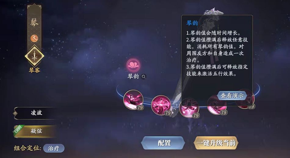 凝弦“凝弦”就是纯奶妈方向了,核心技能【汉宫秋月】是团队下副本的依仗,50秒冷却CD,所带来的超强回复是其他回复技能无法比拟的,只不过这个技能限制苛刻,释放期间不能释放其他技能,五秒时间只能靠走位躲避。建议团队多名成员血量较低时再使用,只奶一位略显浪费。群奶技能一上,团队生存率大增。