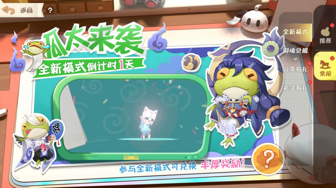 2022年3月20日,全新玩法呱太来袭首次开放!在此模式中式神们需要使出浑身解数躲避呱太妖气的袭击,并成功封印胧车。小妖怪们能否在倒计时前成为最后的赢家呢,快来试试吧~