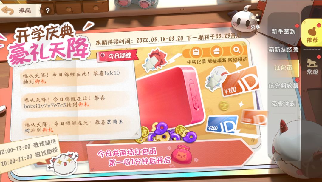 为了庆祝春日大作战测试正式开启,游戏内将开启三场红包雨活动,时间分别为3月18-3月20日,3月23日-3月24日,3月30日-4月1日的中午12:00-13:00和晚上20:00-21:00。红包雨期间,玩家可在游戏大厅掉落的红包中,点击获得红包。打开红包即可获得金币、御札、魂玉以及100元京东卡等实体奖励!