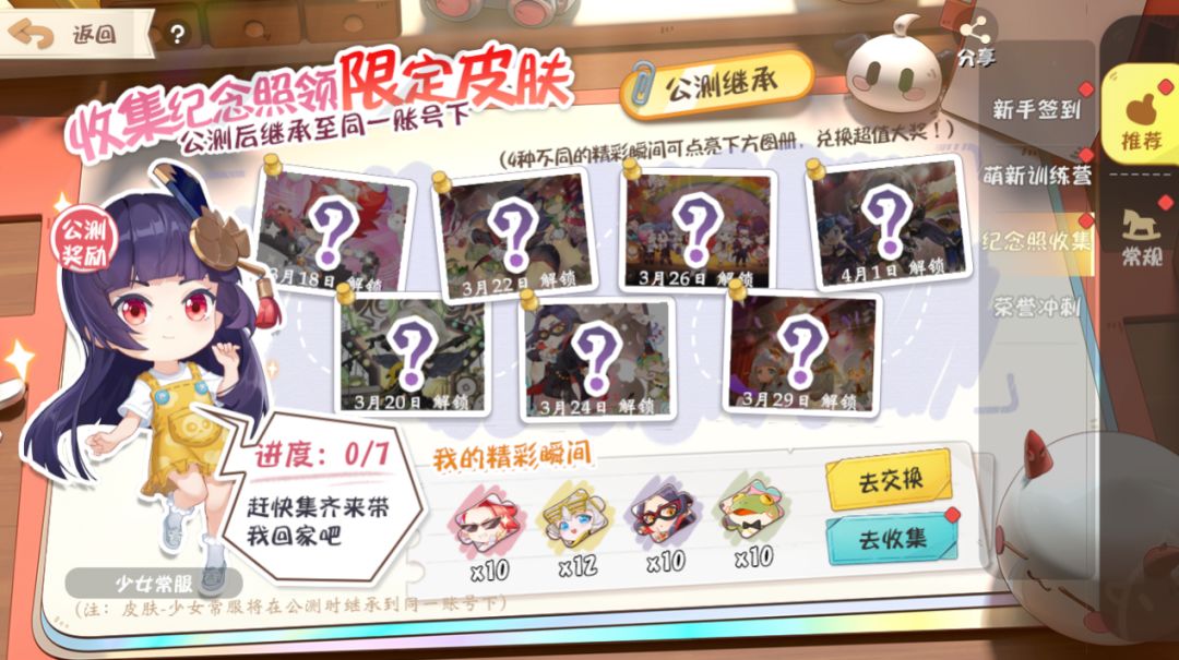 测试期间,完成任务即可获得精彩瞬间,解锁纪念照。点亮7张照片后还可获得红叶公测永久皮肤:少女常服!纪念照还可以兑换幸运礼盒,获得金币、御札和勾玉奖励。