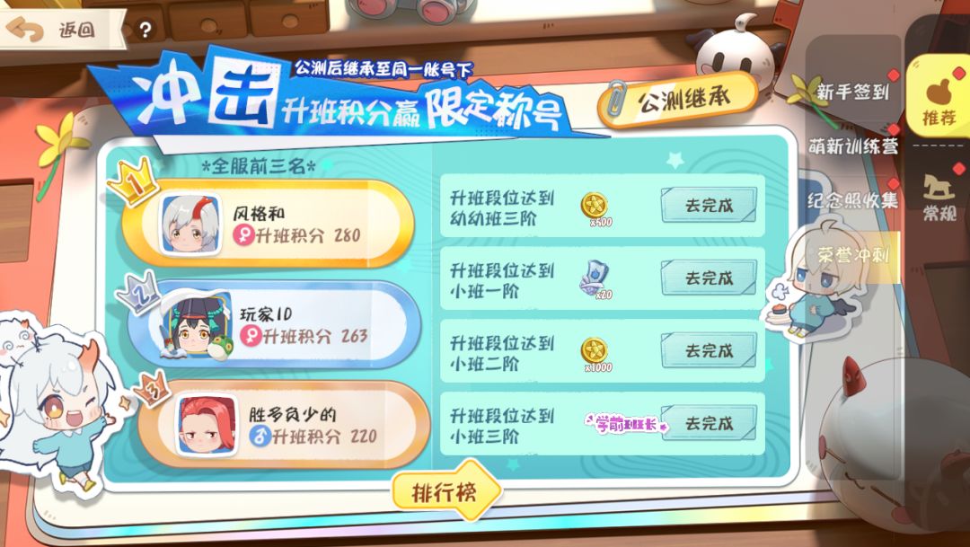 测试期间,参加冲击升班积分活动,提升升班段位获得丰富奖励,升班段位达到三阶后可赢取公测限定称号【学前班长】。