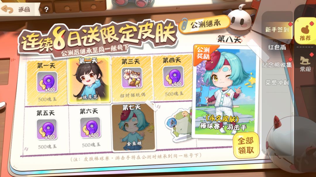 测试期间,登录游戏即可领取丰厚奖励。累计登录8日,即可领取能够继承到公测的金鱼姬皮肤:棒球赛·游击手。此外,由于本次测试为不计费测试,我们在每日签到中加入了大量魂玉奖励,家长大人们通过签到即可获得。快点拿上魂玉给崽崽们买最可爱的衣服吧!