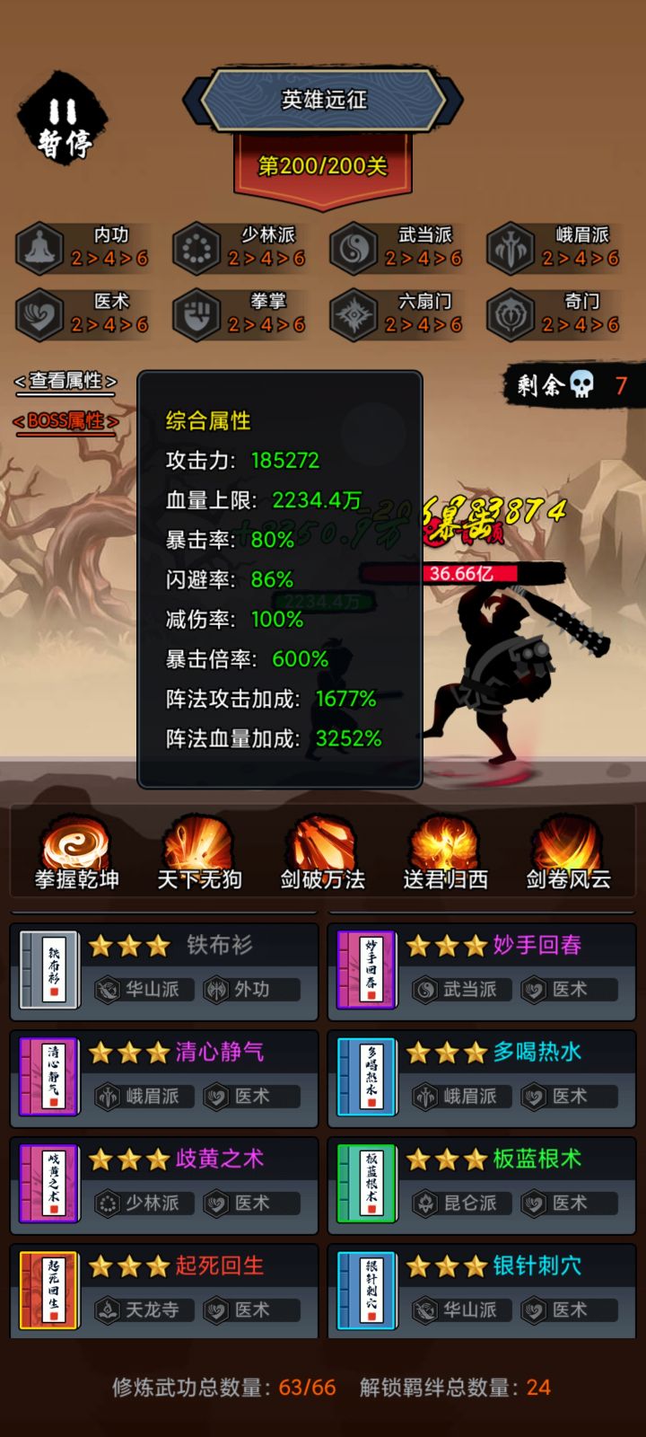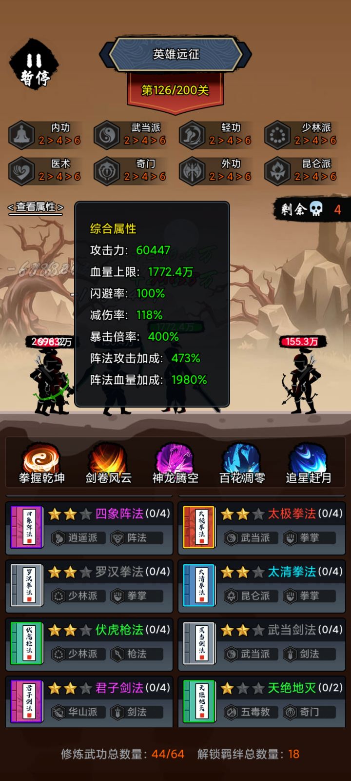 先说一下机制,远征最困难的就是后期BOSS一刀就会砍死人,别管穿装备还是不穿装备,前期没运营好就一刀的事。所以我们要做到第一点就是让血量和减伤尽可能的高,而血量的成长只有一个办法就是4阵法,每次闪避+1%,因此我们前期最重要的就是凑齐4阵法+6轻功,回复的话则是依靠6医术+6昆仑。