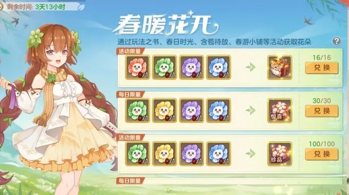 1.活动期间可参与玩法之书、春日时光、含苞待放、春游小铺获得花朵