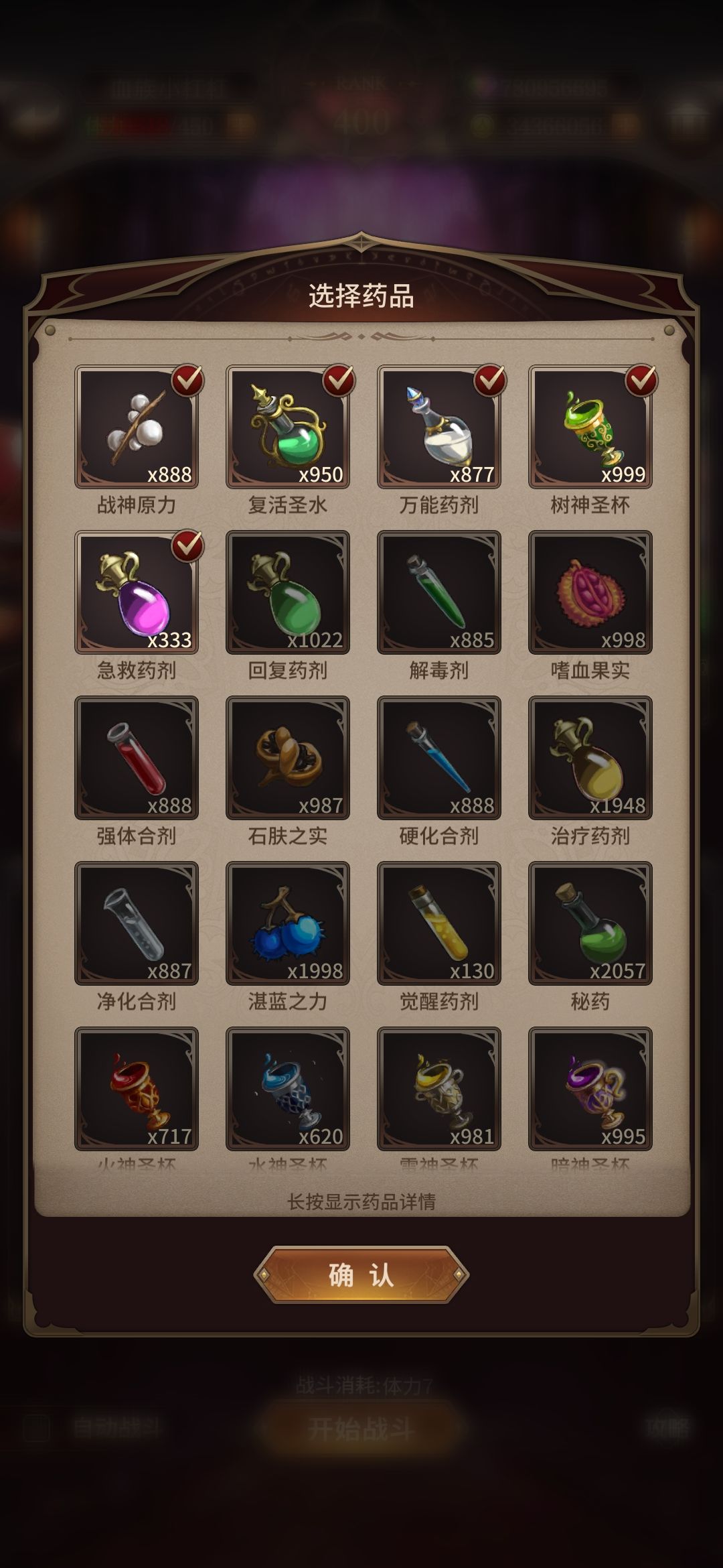 陆陆续续战前药品选择有不少小伙伴抱怨,战前药品选择列表无法显示药品详情,并且使用不便,经常导致药品浪费;程序小哥经过200根头发的不懈努力,终于修复了问题,在新版本中,已选取的药品将会显示在列表的最前,长按药品可以查看具体效果,并且药品的顺序也不会经常错乱啦(希望)!