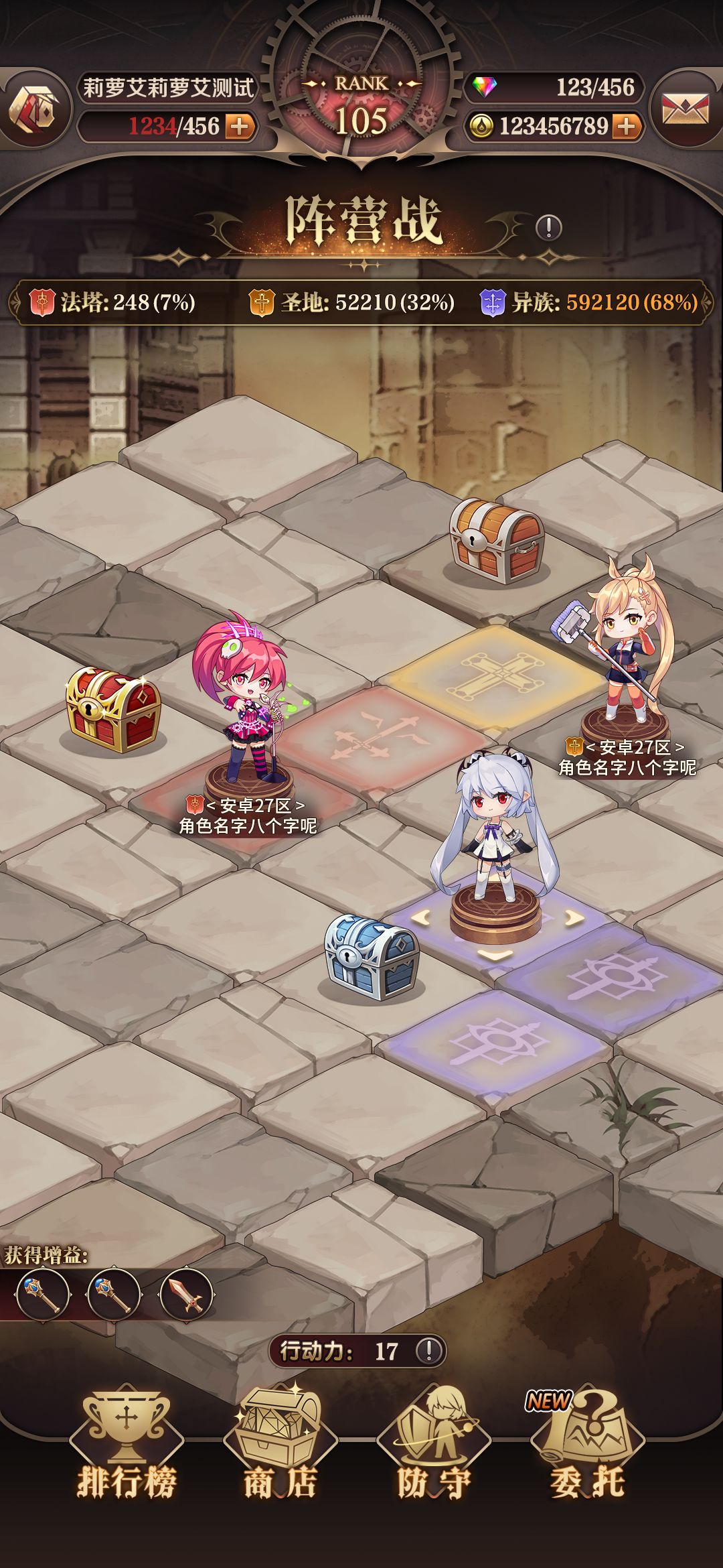 2、所有玩家可以选择代表自己阵营的棋子,选定之后将被投入到巨大的沙盘当中,可以通过放置防守队伍占领沙盘上的领地(所有行为均是实时演算,小心敌对阵营的偷袭哦),并通过领地定时获得声望(不同领地获取的声望不同);最终占领领地多的阵营获胜,该阵营所有玩家都可获得钻石奖励。