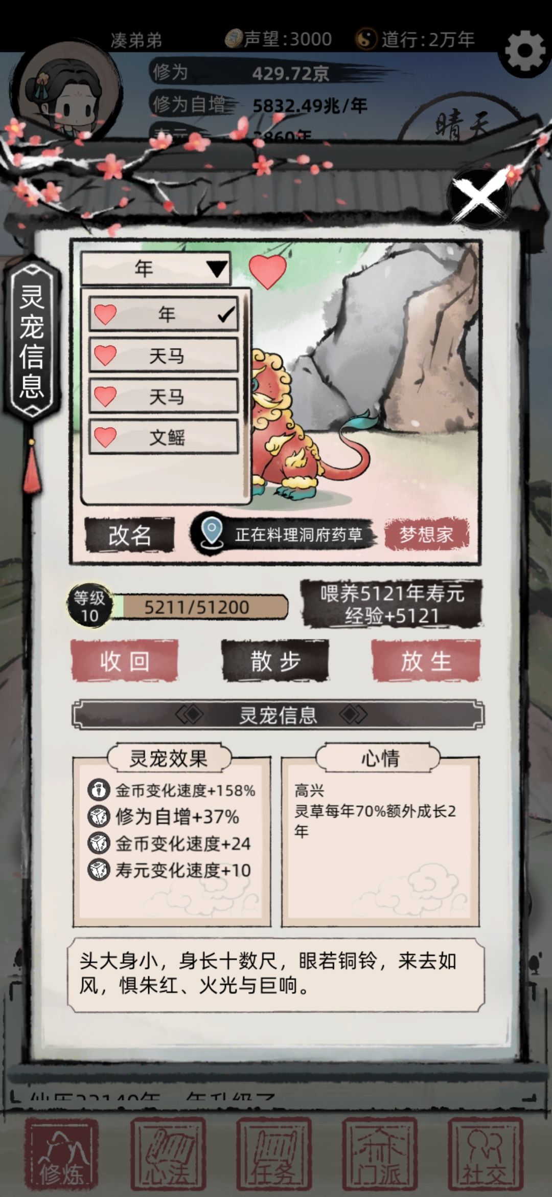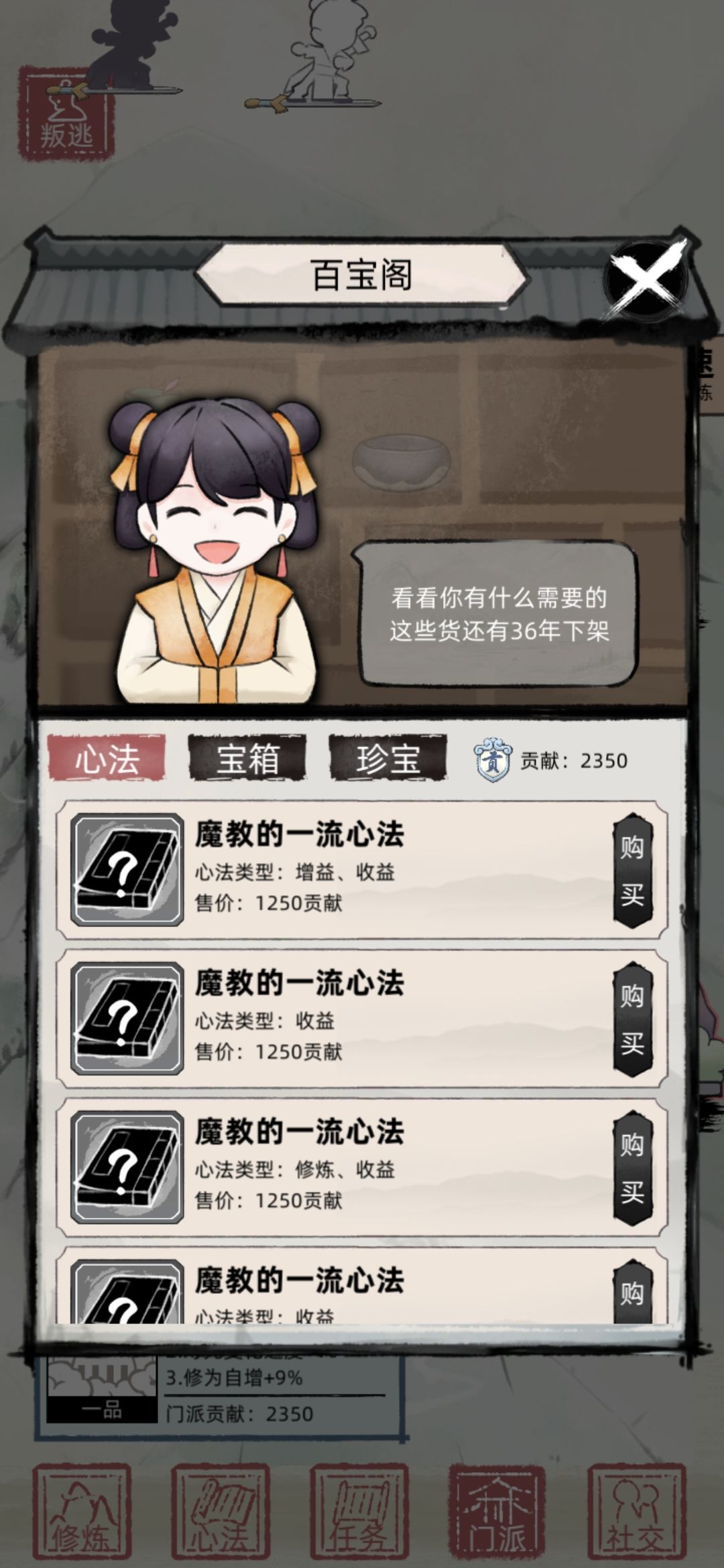 第四部:正派的心法,升级可以自增钱和寿命,最好选择词条有自增钱的功法