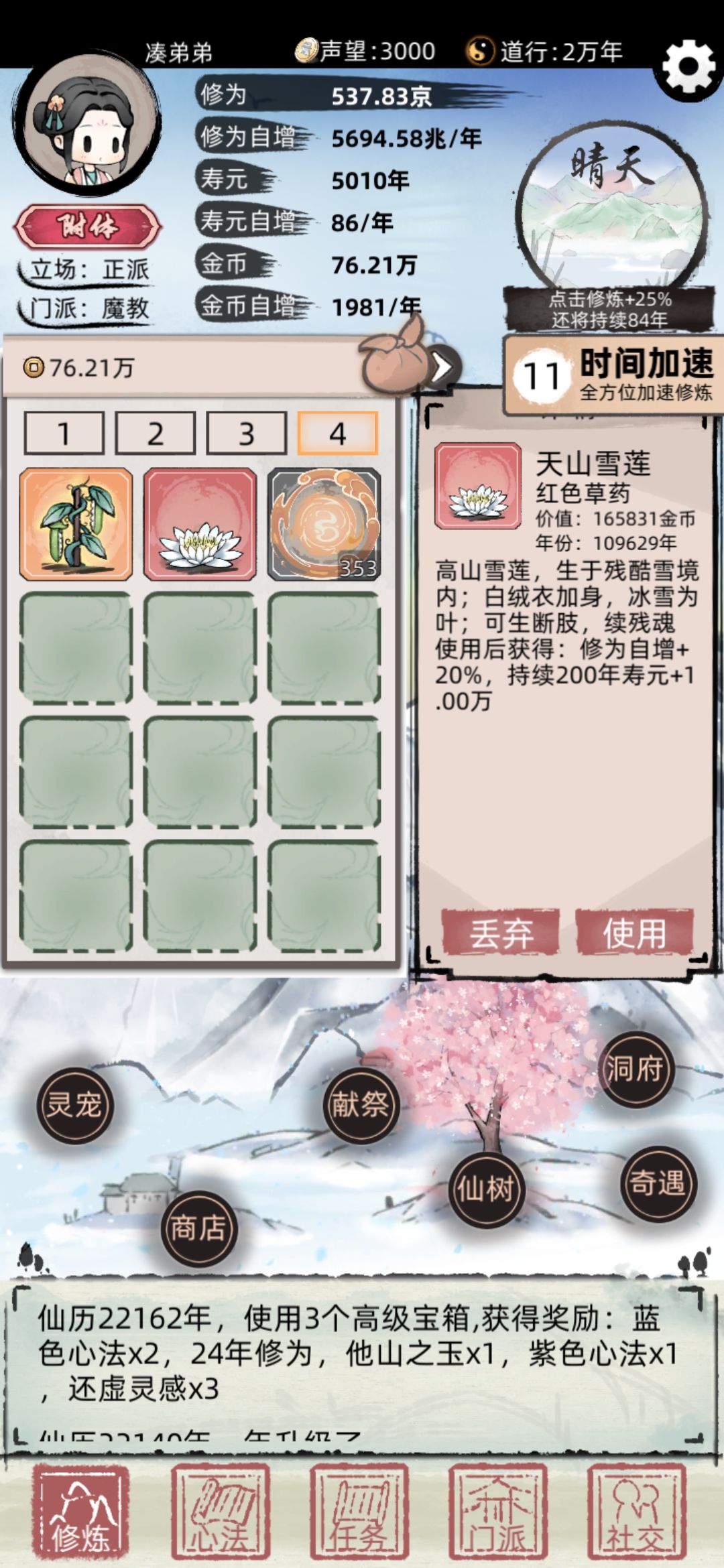 第五部:法宝炼化,开启洞府,养花,养能自增钱的花,也可以养雪莲,它能自增修为【要飞升的话,它会绝对是你不二选择】