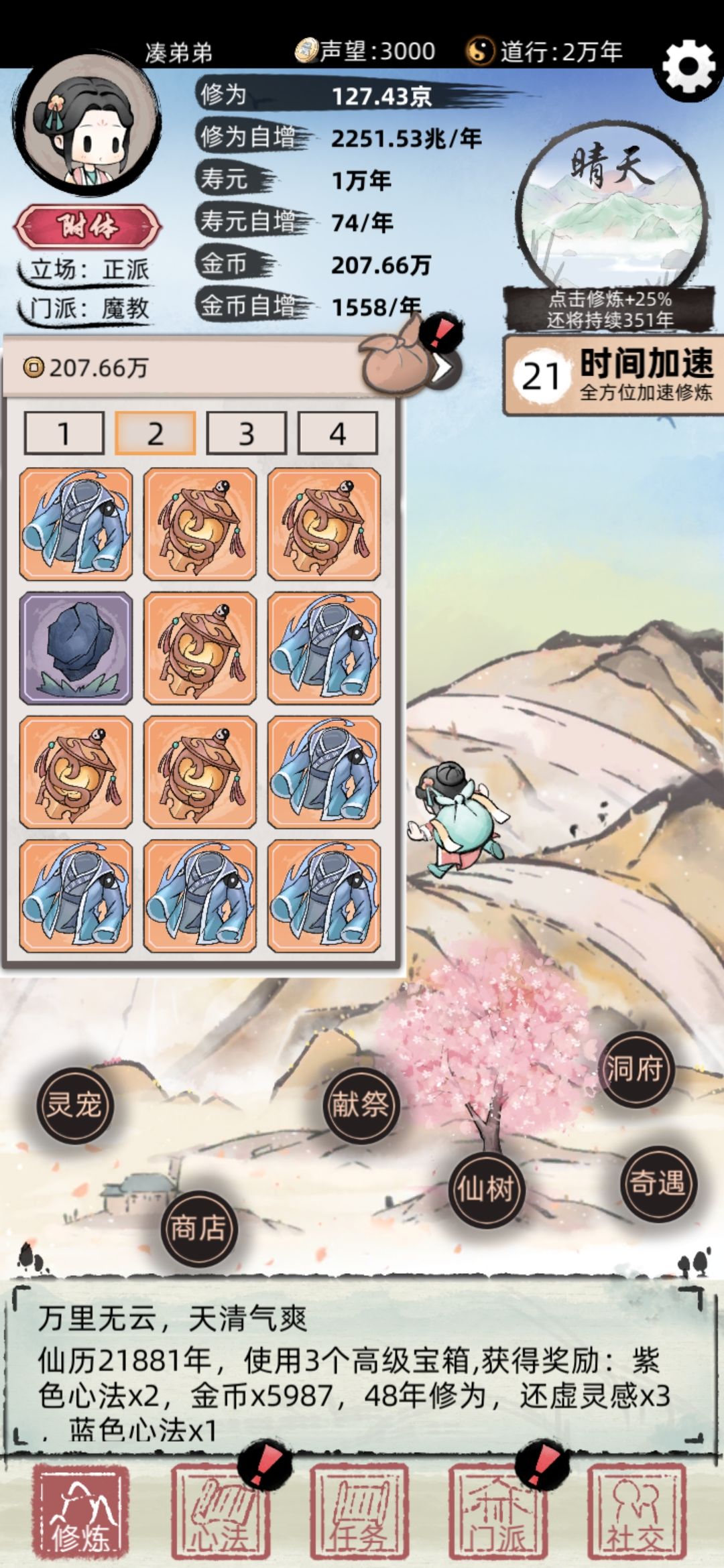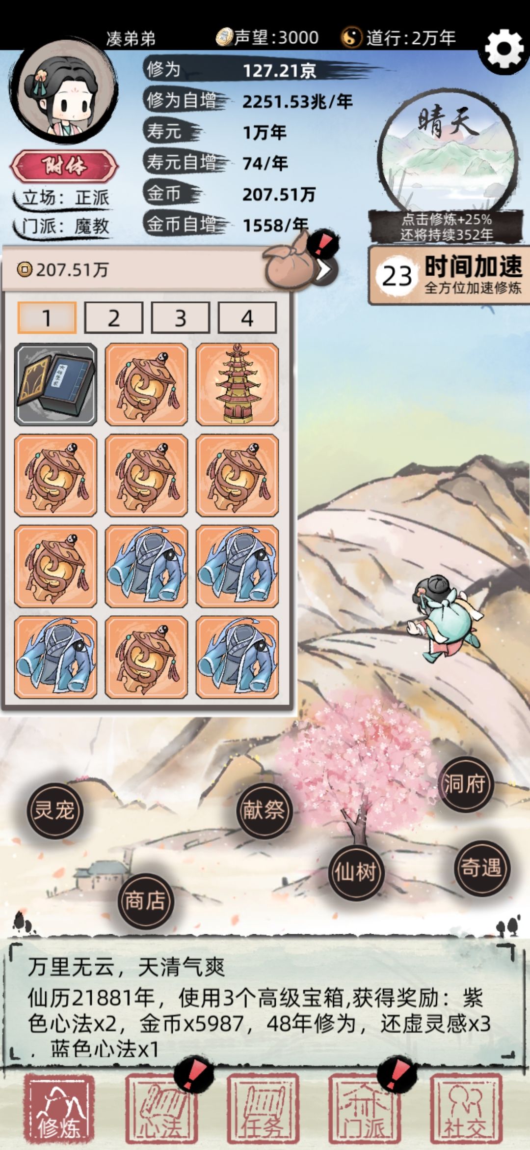 然后你就可以打劫商店了,神马宝箱,神马法宝,神马功法,神马药都统统抢走,没人比你有钱,开格子,把背包塞满法宝,加修为用的,你就会发现,随便玩两下就能飞升。
