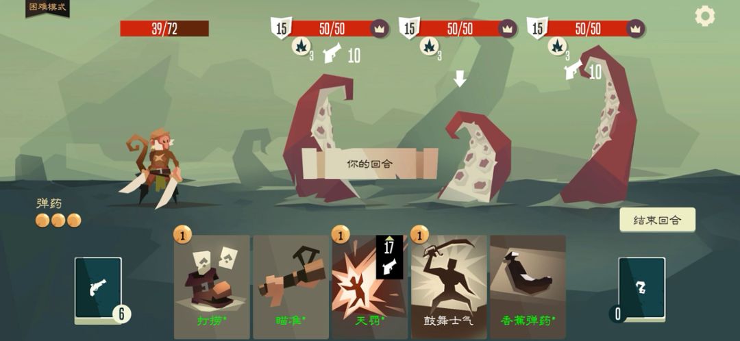 下限相当高的猴,只需要不断的回复弹药,并将弹药投入玩伴即可获得大量护甲并打出一定的伤害,因此前期不建议删除香蕉弹药。蜂窝诱饵能命令熊攻击并施加重伤,但由于你不使用攻击卡指定目标时熊不会攻击,这张卡十分不好用,建议尽早删除。毒箭的伤害和施加重伤并不高,但他可以指定熊的攻击目标并增加攻击次数,在没有更好的替代卡时不建议删除。