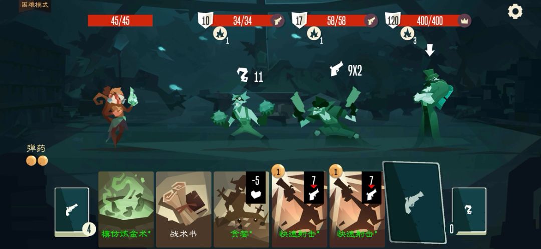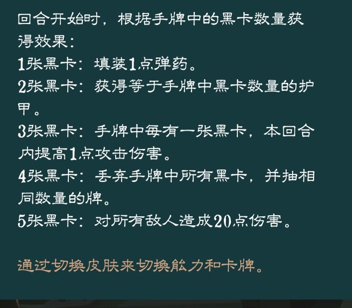 前期卡组黑卡较少而普通卡较多时,通常每回合都能触发第一个效果填装弹药,增加容错。模仿剪断没强化时只能扔黑卡抽卡,但强化后就能高效地将手牌与卡组中的黑卡转化为弹药,建议优先强化。黑暗射击不仅伤害不错,还自带暴击,但需要丢弃手中的黑牌,因此黑猴非常需要过牌,拿卡时优先考虑优质的过牌卡与没有负面效果的黑卡