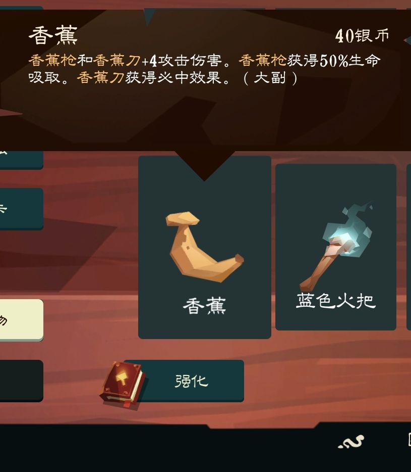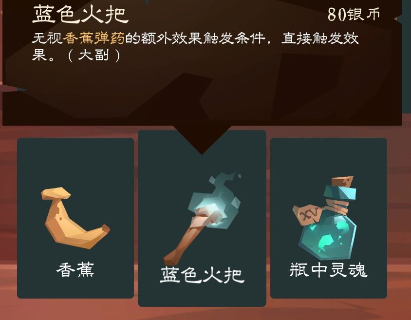 香蕉提供了超大幅的增伤,但只对初始的香蕉刀/香蕉枪起效。由于大副的初始牌组通常会有大量的变形香蕉,在前期拿到香蕉会让你非常容易处理普通敌人,弹药充足时香蕉枪的吸血效果也非常强大。如果玩极简卡组最好在第三章之前删光变形香蕉,所以在需要金币或者卡组成型时香蕉就可以光荣下岗了。如果玩混乱流派的话可以考虑保留香蕉从而获得高伤害的必中香蕉刀。大副任务解锁