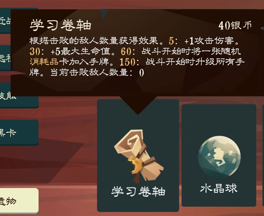 学习卷轴是探险猴的专属遗物,前期就可以提供1点稳定的攻击伤害,但后面的效果似乎并不强大且难以触发。但他的专属卡牌非常给力,涂鸦可以复制强大的移除与消耗品卡牌,但在没有强化时会随机复制手牌,如果有需要复制的卡牌可以优先强化涂鸦。另一张专属卡牌寻宝更加给力,使用寻宝多次干掉敌人就可以使奖励选项变成五个,从而有非常大的概率拿到想要的卡与遗物。