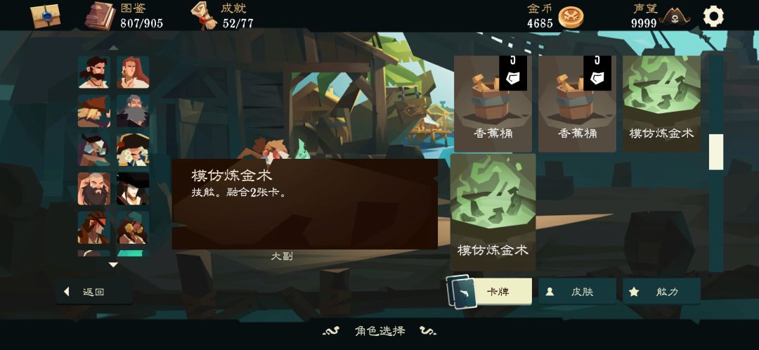 总体而言,大副的大部分皮肤都有着稳定的回复卡香蕉桶与回弹卡香蕉弹药(占卜皮肤有月亮和魔术师),初始弹药量为3,初始银币为75,一般主走旅馆,先删变形香蕉与一桶,可以考虑删一弹