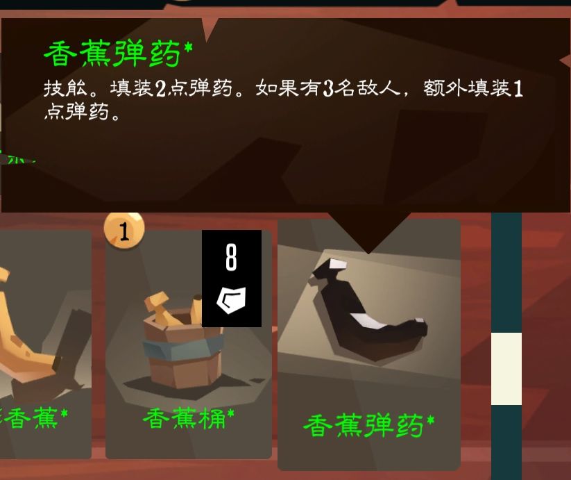 香蕉弹药的特殊效果(面对三个敌人时额外装填一个弹药)通常难以触发,但在能触发的情况下非常给力