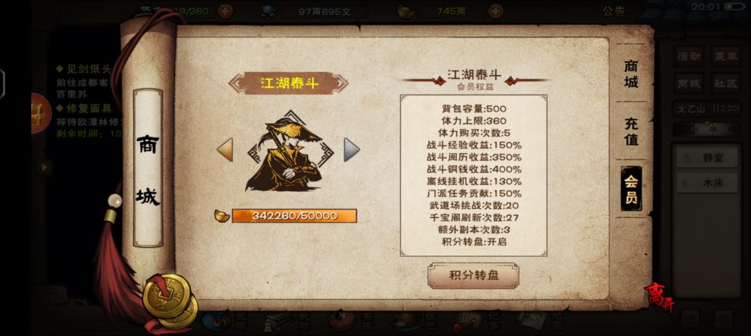 5.第二天,学个水上漂一重,去拿文皇经,雁行九重升的快可以第一天拿,升到200级。然后去沙盘推演,300级后,请教升级合斗守御300级。继续刷野升级钢筋铁骨。45级左右可以尝试墨门副本。这时候我们可以去升级烹饪和炼丹了(一定要文皇经200级),烹饪最好做爆虾菜心材料来源多,炼丹炼跌打药50个,还有南阳老中医每天打工基本上150很简单。(小提示火工老头有烹饪加成,萧佩吟有弹琴加成),我们这时候可以去做主线做到剑柄之谜的时候我们可以提前进太乙学习道学做准备,(去书店买道德经就行,后面书和秘技可以存在凤鸣书院藏书阁)其他时候只有太乙可以从楼顶跳进入少林60级后才行。做到三潭那停,水上票我没升,因为少林一苇渡江一重比水九还好,省我几万阅历。没事可以去拿洛阳宝藏,泰山宝藏和天山宝藏。