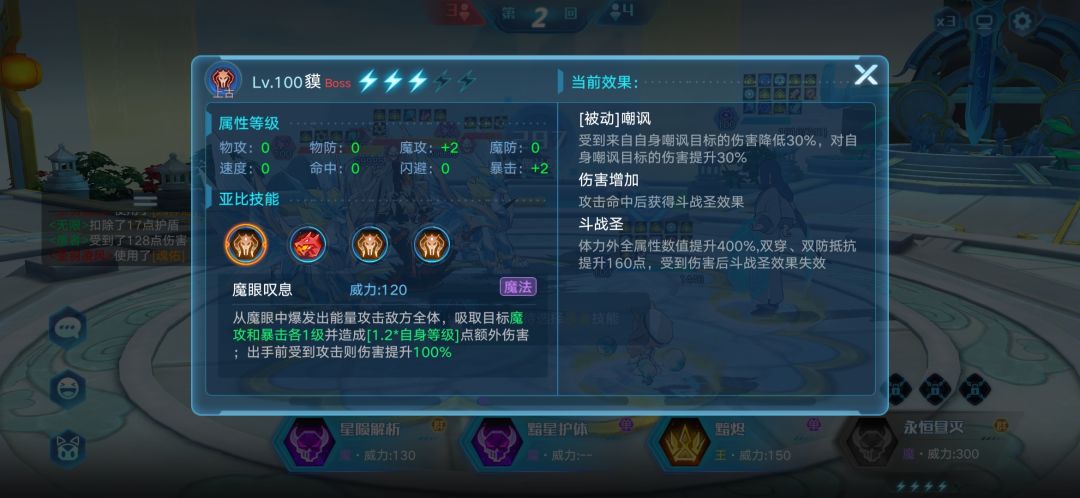其实个人感觉满速的意义不大,因为他的战神状态是除提升体力外全属性提升200%(下面的截图显示的是头像的,所以是400%),也就是说速度也包含在内,所以说你即便是满速,也不一定能在速度方面比boss快。