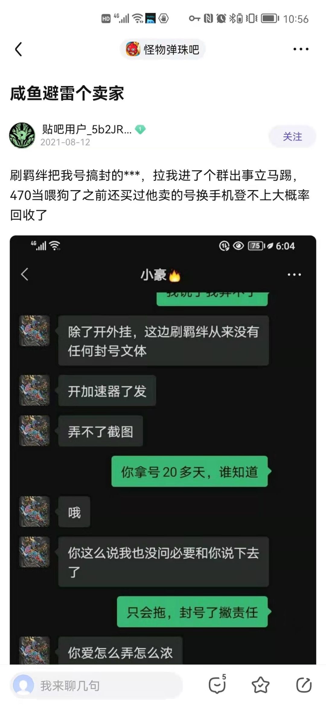 奸商名称:小豪 怂恿萌新买号 购买是大家的自由大家有自己选择的权力 货比三家是常有的事 但是他给萌新一个不正确的价值观 如果你是一个萌新去他哪里询问他就会给你推荐一些贵的 什么什么组合好 然后让你买 如果你稍有犹豫他就会很不耐烦 美名其曰 我这里不喜欢墨迹的人 我相信大家谁的钱都不是轻易得来的 更何况他哪里的号并不便宜 在花钱之前肯定有先三思而后行 接着在你买完新号之后就会很“热心”地询问你近段游戏时间如何 刷了多少个极运 有没有打轰 等等类似问题 会给你洗脑 让你冲动消费 一个集运12r 水四暗四一个八十 我有一个朋友的暗四甚至被他收一百 一次过狱一百八 这些都是让萌新白白地话冤枉钱 他收钱之前是一个态度收钱之后是一个态度 这就是一个“不喜欢墨迹的商家”嘛 当买家当狗玩了 本来这游戏新鲜血液就少 萌新上手不是那么容易 还要花这么多冤枉钱 大家还想入坑吗? 代练问题 我的好友给他刷了狱 30层ex 出了阿赖耶 奸商只同意补五块钱 一个阿赖耶单价50~80 他就补五块钱 试问大家如果是你你会气吗 自己辛辛苦苦接单好不容易出了阿赖耶结果他只给补五块 格局太小了 我都不知道他怎么说得出口了 奸商在售阿赖耶单价八十一个 一个集运阿赖耶要8k 我真的会笑 他不肯补多点辛苦钱 我的好友一气之下把阿赖耶卖了 他说我朋友小气 斤斤计较是个小人 你不仁怪别人不义 一个轰卖萌新一倍甚至以上的价格 过一次狱 包一次联动 他要赚成倍 群友的评价是“赚一天钱吃不了一顿好的 豪哥哥倒卖倒卖号就发家了捏” 羁绊问题 群友的原话:我17号羁绊问他3月2号能不能出卷,他说可以,然后28问他说没出明天出,然后问还是明天出,然后3月2号十一点,我上号一看一张也没有 我问他,他说反正也不一定出,不如不抽等鬼灭。 这位群友境界联动二期木已高达85运搏一搏是可以集运的 结果被奸商耽误到了 口口声声答应别人联动结束之前可以有卷 让别人空欢喜 就问如果是大家 大家气不气 还有羁绊没给人刷完的 刷羁绊开挂导致号被封了 他有一个专门的群叫怪物弹珠群带火花的表情 里面是他开的小号 怂恿别人和群主买号 就和舔狗一样 天天嗷嗷叫 刺激别人转生 让大家为他买单 望周知!! 已经有很多人上当受骗被坑 很欢迎大家入坑怪物弹珠 我们需要一个良好的游戏环境 而不是 只会被这个奸商把风气都败坏了 大家买号认准淘宝询问大佬这个奸商必死#奸商# #怪物弹珠# #闲鱼#