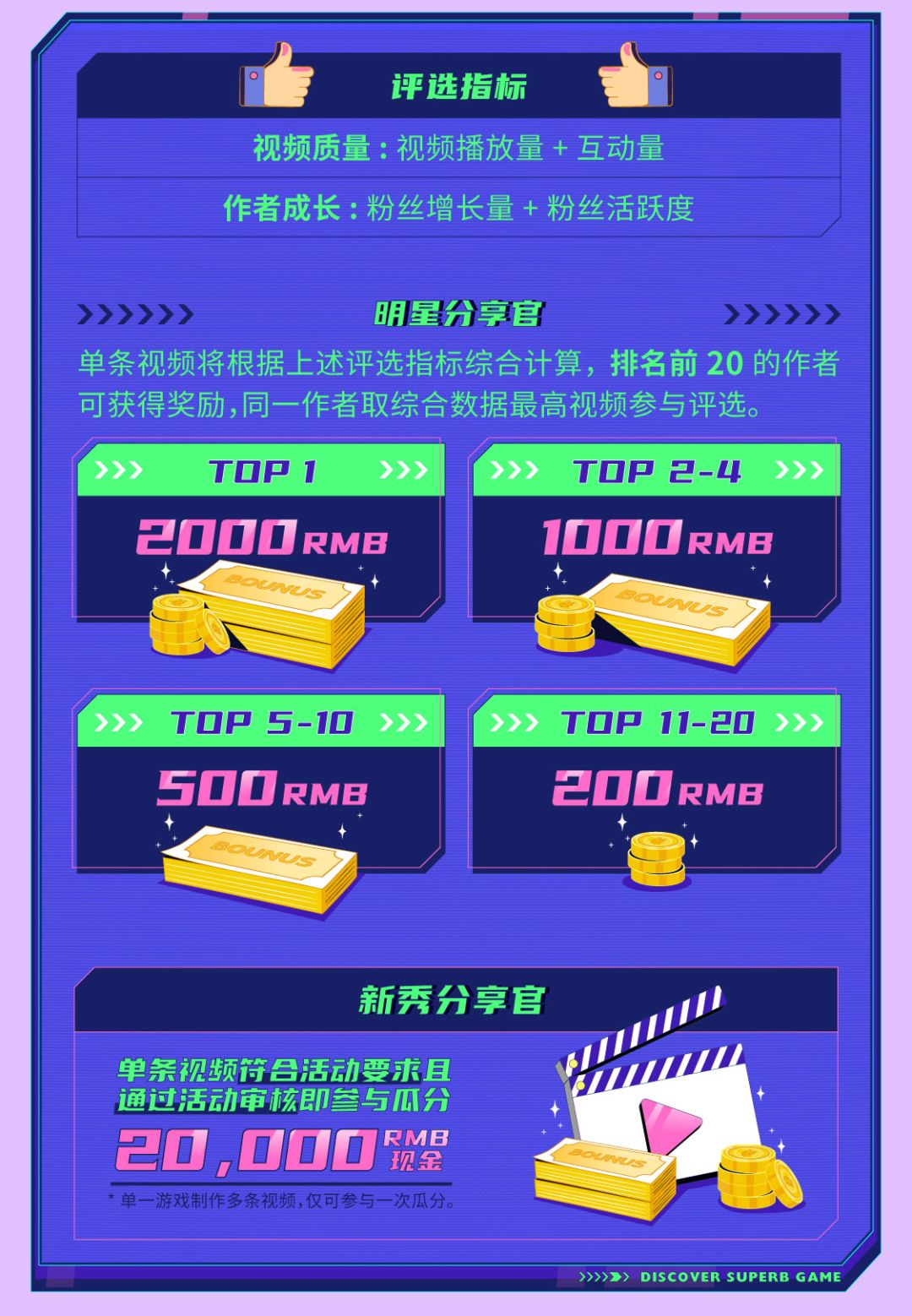 明星分享官:单条视频根据评选指标综合计算,排名前20的作者可获奖励,同一作者取综合数据最高视频参与评选