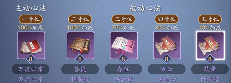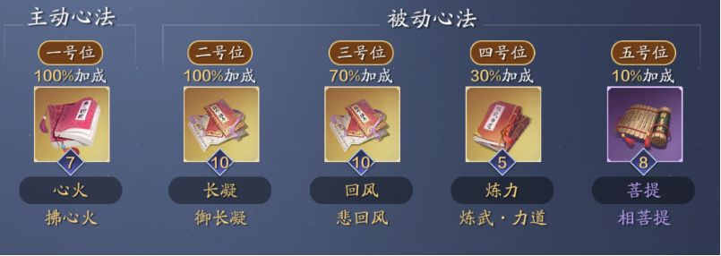 这套心法是目前大部分周卡/月卡少侠的配置。可能各位少侠的心法等级略有不同,但是组合都是大差不大的。这套组合完美的结合了攻守兼备——如果练武的等级够高,还可逐步提高到1号位置;如果有两本练武那是最佳组合,可将杀菩提进行替换。当前主动心法也可以使用流毒,看各位少侠之前门派的主动心法来决定。