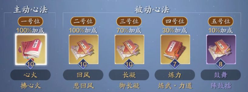 这套心法组合中总共有4本金色心法,也是老区的平均水平。但是心法等级不同、氪度的少侠有区别。被动心法1号位,建议使用满级悲回风;如果练武等级能超过悲回风时,建议再使用练武。后面的位置依次往后推——御长凝还是要使用的,毕竟功力加成摆在这里,同时新开的话本对生存也有一定要求的;最后一本也可以替换成破空明,因为图例这套心法也会在群战中使用,阵鼓擂更加通用一些。