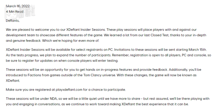 此后《XDefiant》一直没有消息,沉寂了将近半年。直到2022年3月16日,开发团队又发布了一篇日志,提到了一个叫做“内幕会议”(Insider Sessions)的项目。自3月15日起,育碧将逐步为一部分参与注册的玩家开启进入“内幕会议”测试游戏的资格,让玩家与育碧的开发团队“并肩作战”,从而提供更多的反馈意见。