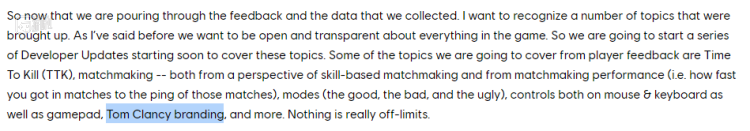 即便承受了一定争议,《XDefiant》当时还是召集了不少玩家,圆满完成了一次封闭测试。2021年9月,测试结束一个月后,育碧的开发团队写了一篇开发日志,指出封闭测试中玩家集中反馈的一些问题,其中一条就包括汤姆·克兰西的冠名问题。