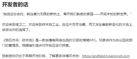 首先猜想游戏类型的朋友可以先停一停了,在《明日方舟:终末地》的开发者的话一栏中可以确定一点,这是个3D即时策略RPG游戏。