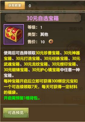 30元自选宝箱打开后除300绑定元宝和7日福袋之外,可以选择领取以下九种宝箱中的一个:30元珍兽宝箱、30元神器宝箱、30元打造宝箱、30元经脉宝箱、30元武魂宝箱、30元龙纹宝箱、30元绶印宝箱、30元锻铸宝箱、30元护心镜宝箱。