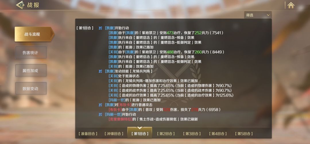 这个战报,前三轮都触发了龙骑兵增伤效果,只有第一轮吃到了,第二三轮到关羽行动时,上回合的效果取消判定时,本回合应该生效的效果一起消失了,是不是程序写的有问题。