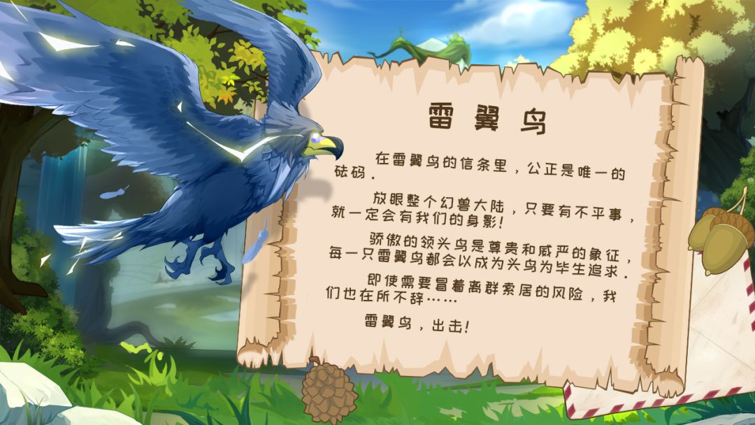 “雷翼鸟很少休息,人们常说的“休息五分钟,活动一整天——指的就是雷翼鸟,雷翼鸟是典型的集群性幻兽,不同的群落都会有各自的“头鸟”——被冠以“雷霆之声”的头衔。头鸟是族群里最有威望智慧的人,评选头鸟的参考标准是有魄力,有远见,战斗实力反而没那么重要。”