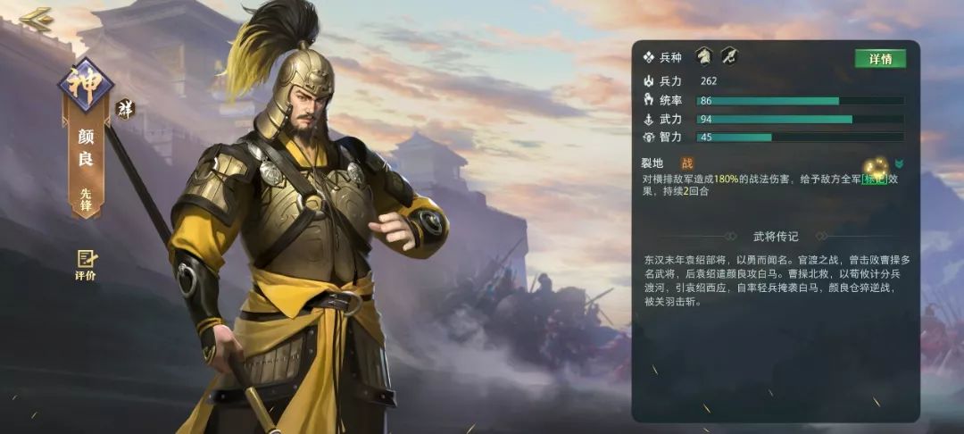 0星颜良的统率86、武力94,0星文丑的统率87、武力95,都是神将中的佼佼者。颜良技能【裂地】是横排伤害,0星时伤害系数高达180%,骑兵、枪兵的兵种组合使得颜良作为核心输出时具有一定的优势;