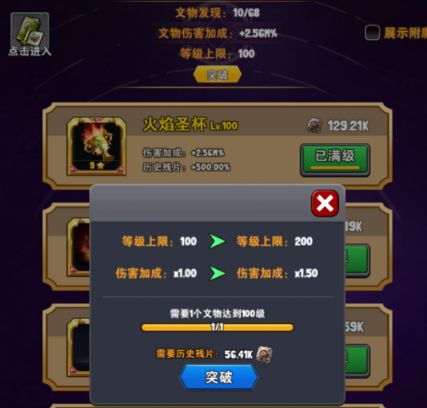 重生之后升级火焰圣杯即可,在火焰圣杯到达100级后,点击上方的突破,然后继续升级火焰圣杯,除非有多余的用不出去的历史残片,否则不需要升级其他的文物。