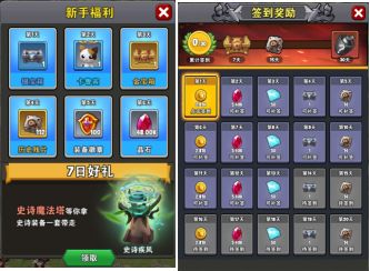 在到达20层后,会开启新手福利,对于提升战斗力帮助有限,尤其是7日好礼,基本七天后已经完全不需要史诗装备了。在到达30层后,会开启每日签到。其中有价值的是上方的7天金宝箱、15天历史残片、30天红装,下方的钻石、残片。