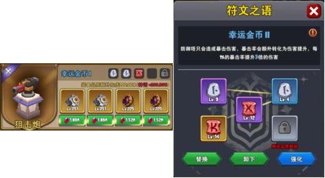 前期主力推荐安装“幸运金币”符文之语,主力塔安装符文之语时,需要注意伤害类型、品质以及等级。