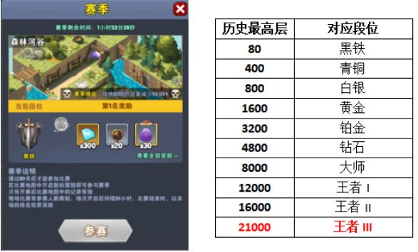 注意2:每周三、周日开启新赛季,凌晨12点时,会根据历史最高层数决定本次赛季的段位,段位决定后,本次赛季不会改变段位;