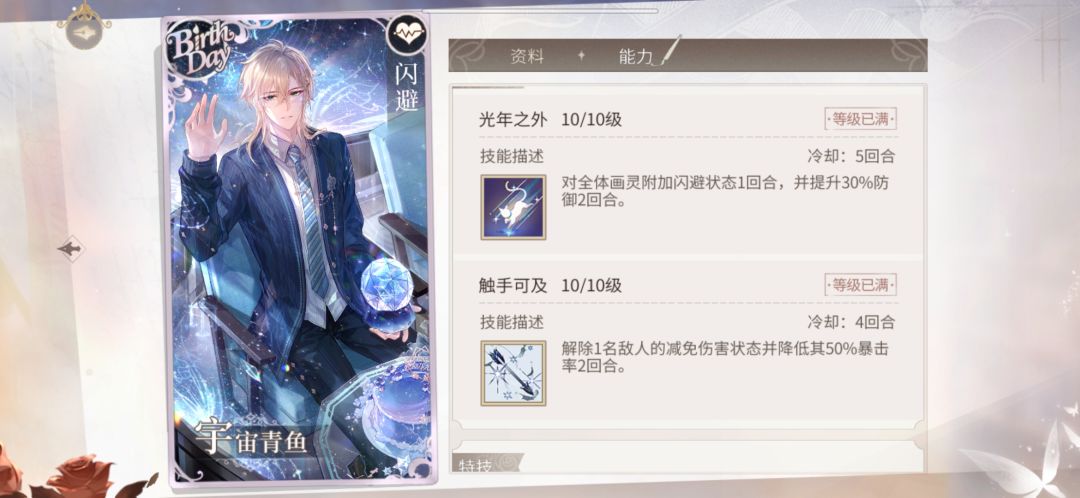 让我们来看看这次的路辰生日卡,1技能全体闪避,CD5回合,妥妥的荆棘/风凌上位替代,并且生日卡等级上限为95级,白值本身就比普通的sr要高一截。