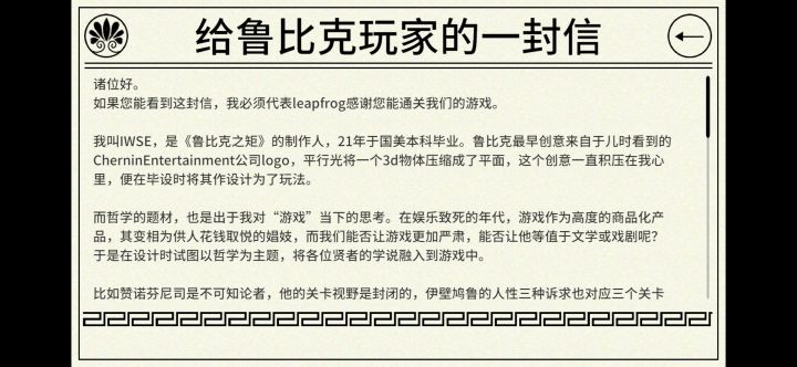 有一点不太满意,就是我在游玩过程中并没有很明显感受到在玩法或者视觉层面让玩家足够深入去探讨了解作者罗列出来的这几位哲学(数学)家的理论,大部分的游戏内容像是最基本的理论普及呈现,虽然做到了一定程度的“严肃”,但是并没有如作者所说到达文字/戏剧or其他载体的深入程度。