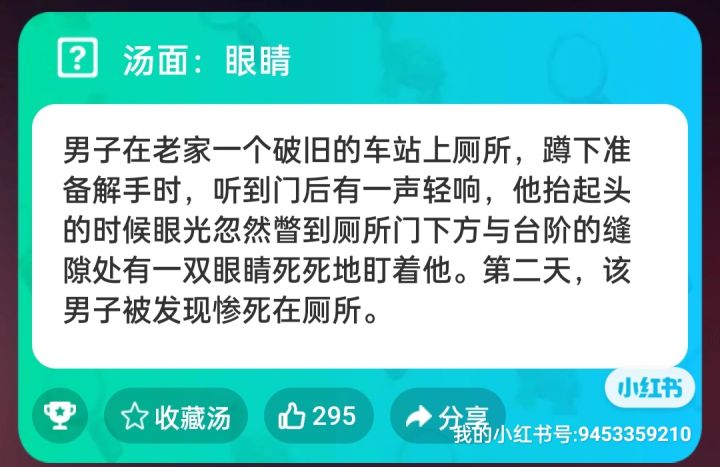 今天给大家推荐一个汤,名字叫眼睛。故事是这样的“一个男子在老家一个破旧的车站上厕所,蹲下解手的时候突然听到门后有一声轻响,他抬起头的时候看到厕所门下方与台阶的缝隙中有一双眼睛死死地盯着他。结果第二天他死了。”