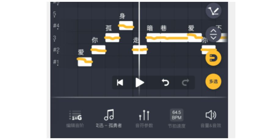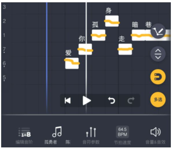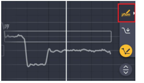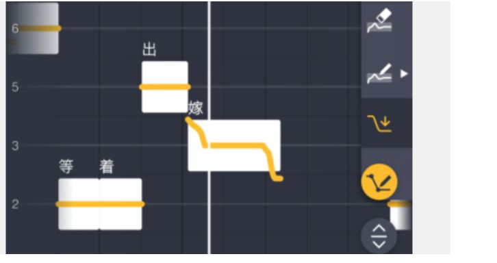 有时候会发现原唱的唱词会有声调,比如明显的第二声,与第四声声调。如果我们想模拟这个声调的变化,就需要使用音调调节工具(调节粗黄线那个)。下面我们一起来看案例演示: