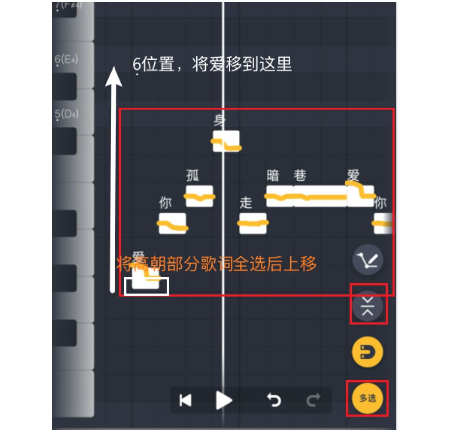 之后你选中所有需要移动的歌词,将“爱"字移动到低6位置。